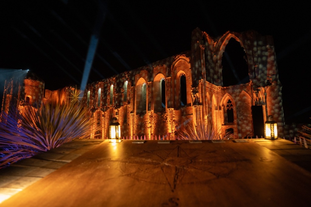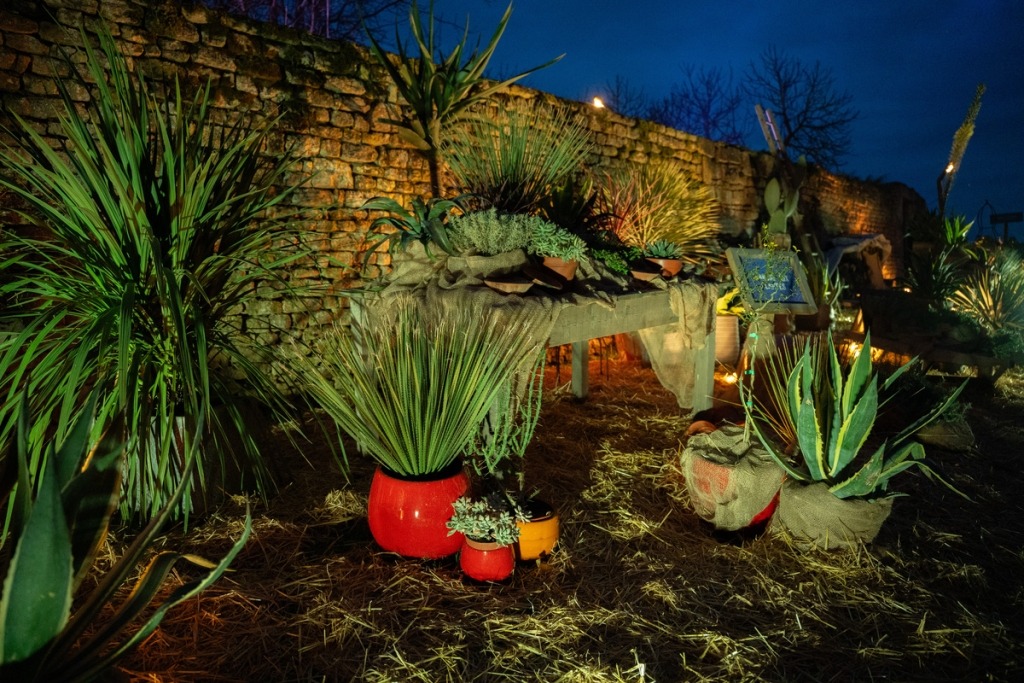 Un univers inspiré du Moyen-Orient où palmiers et végétaux exotiques, sable doré et la douceur des lumières rencontrent la magie de Noël au cœur du site de l’Abbaye de Maillezais.